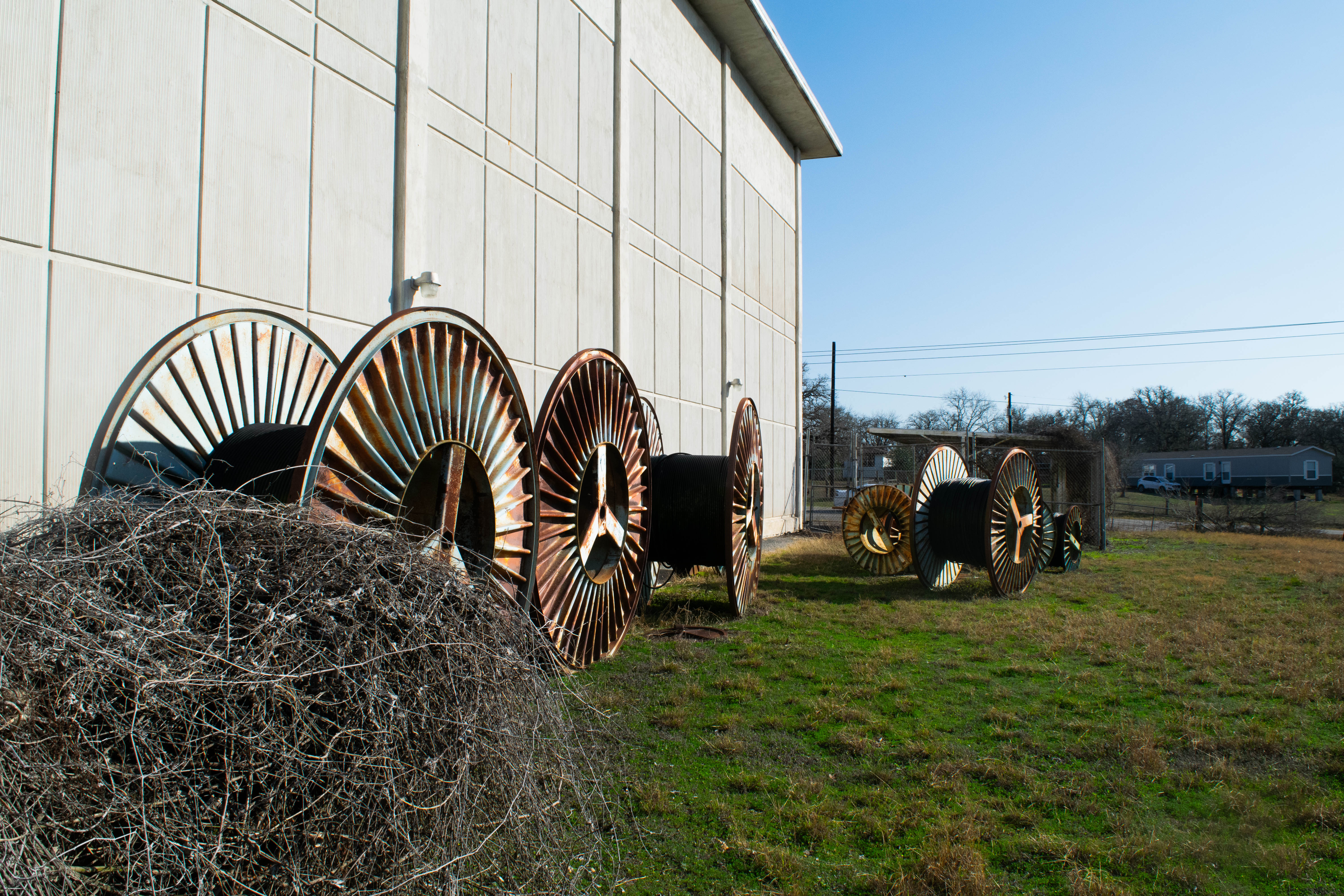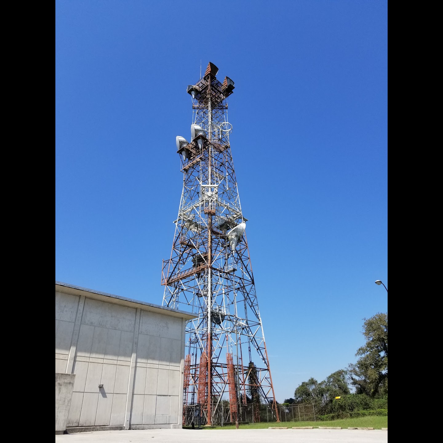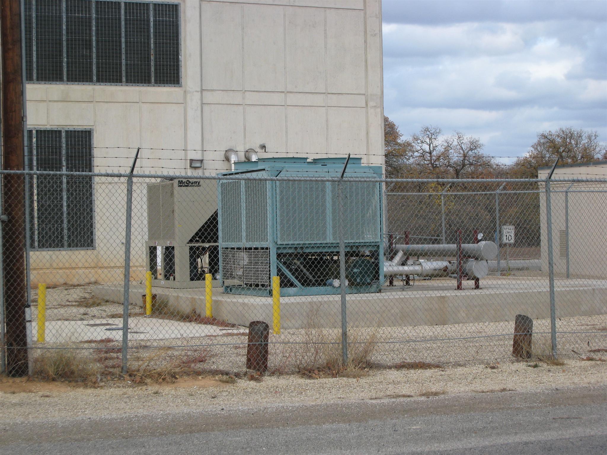 Horns still standing, waveguides disconnected at bottom of tower. Site still seems to be used, despite no fiber optic markers nearby. Front door seems to have a maglock triggered by an RFID scanner now. Building has new air handling units in the front, which were running when we visited.