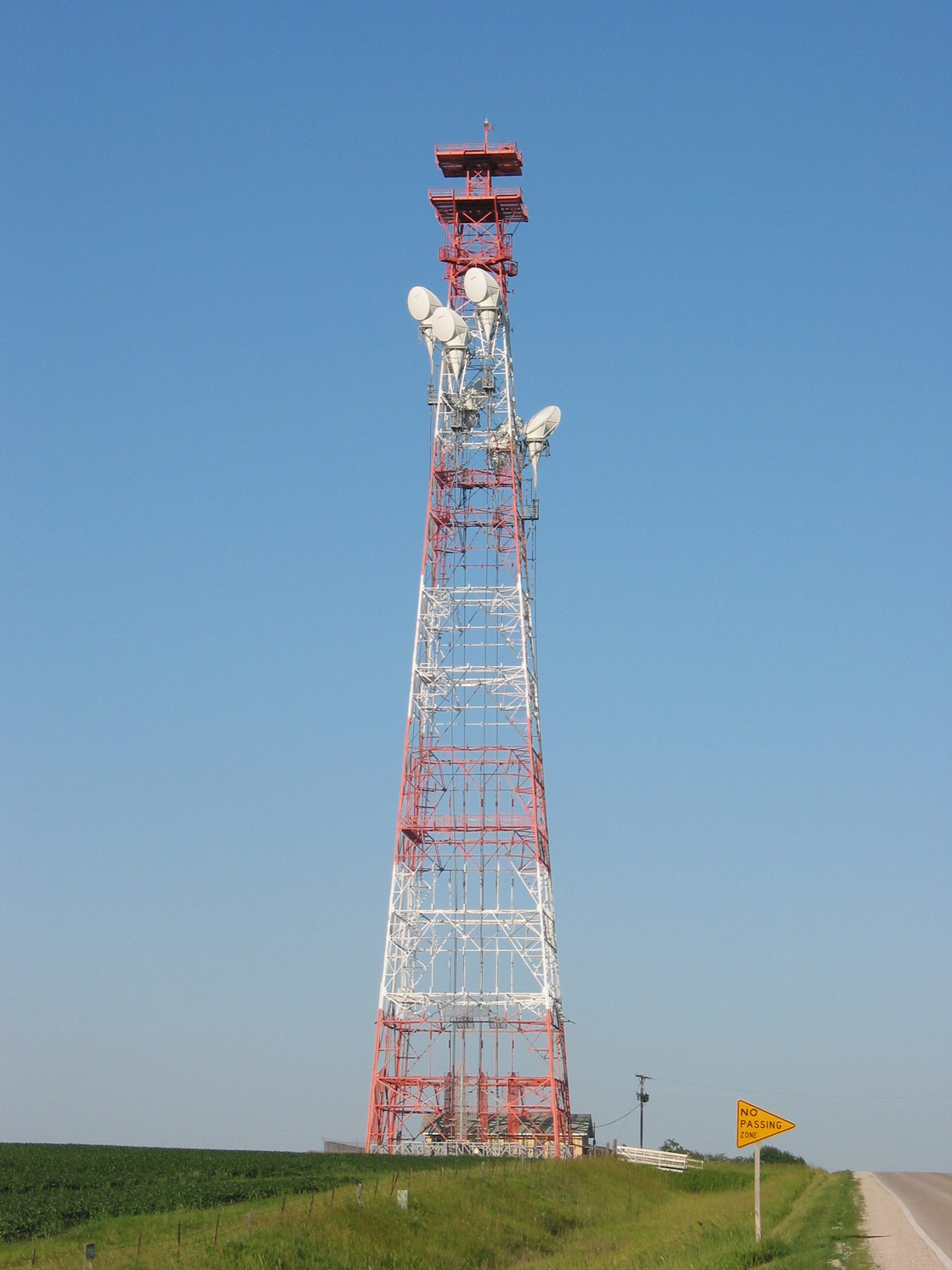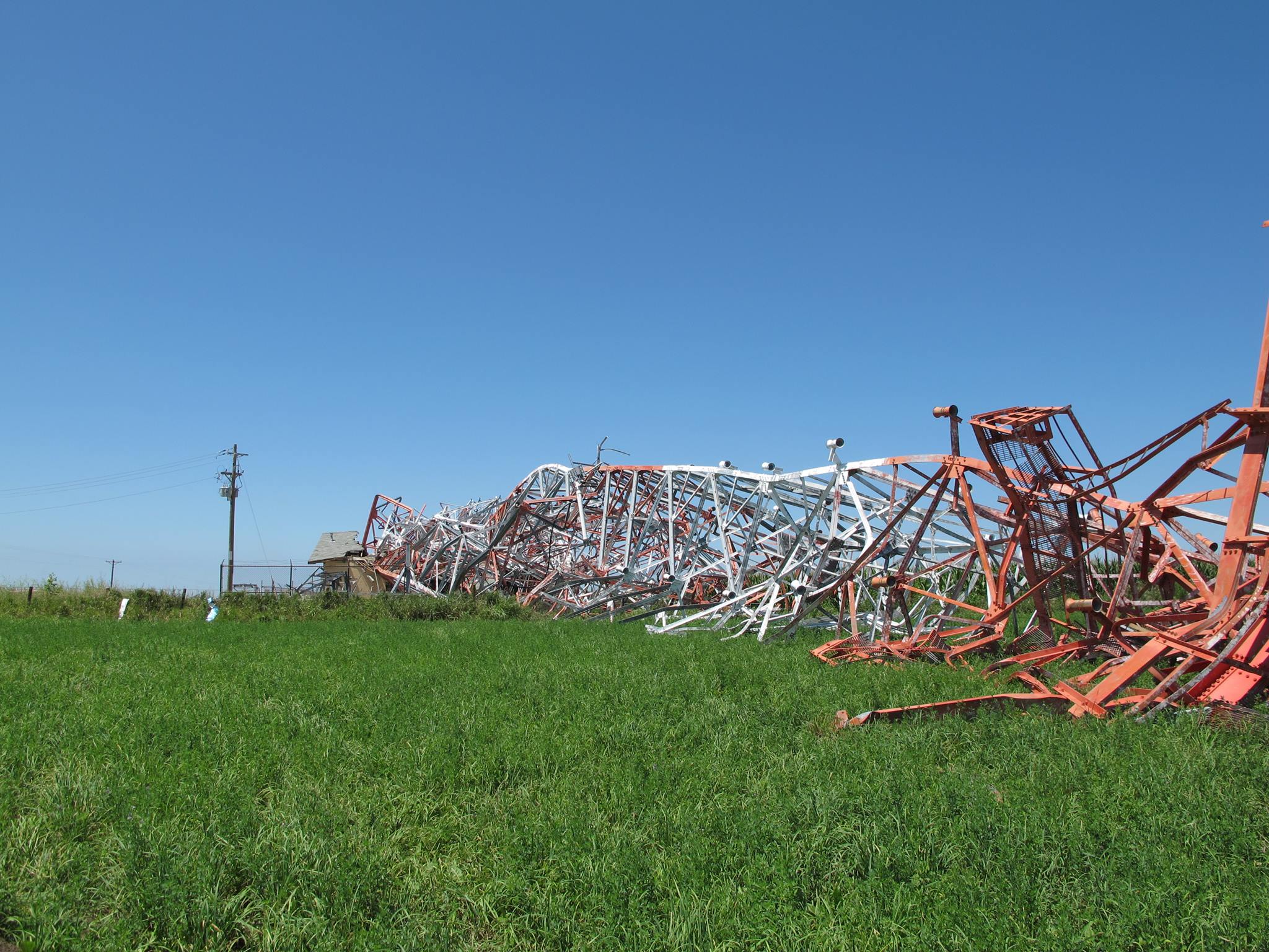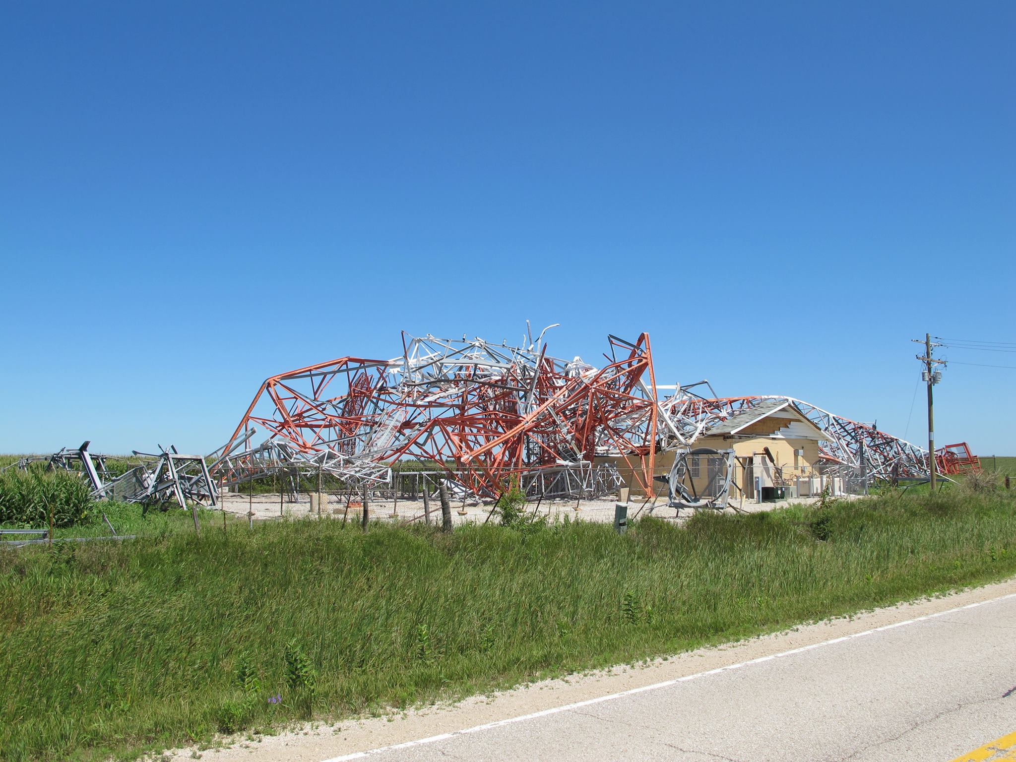 Tower taken down by 130mph winds in 2011 also destroying equipment building. Replaced with a much smaller tower by American Tower. No more buildings on site.